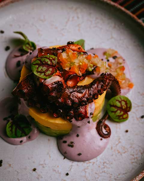 Pieuvre grillée sur causa de pomme de terre et d’avocat, quinoa croquant, sauce aux olives Botija et chalaquita.
