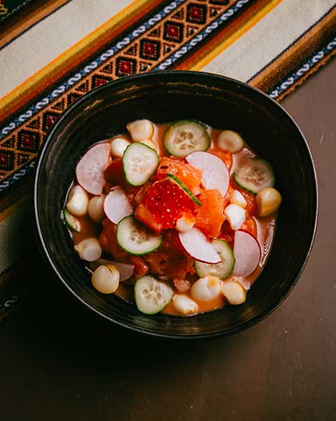 Saumon frais mariné dans une leche de tigre ponzu, garni de concombre croustillant, oignon rouge, togarashi, radis, choclo et caviar de truite.