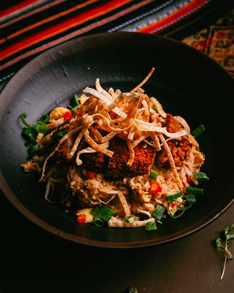 Nouilles spaghetti sautées dans la sauce soja avec poulet croustillant doré, tomates, oignons rouges, oignons verts et coriandre fraîche.