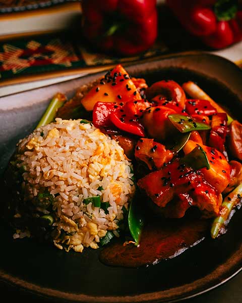 Poulet pané croustillant, nouilles chinoises, germes de soja, pois mange-tout, oignons verts et poivron rouge.