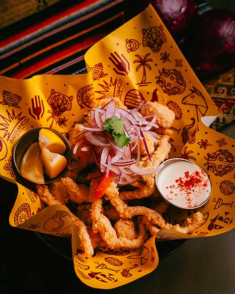 Le complice du Ceviche! Mélange de calamars, moules, crevettes et Mahi Mahi frits dans une panure à l’Ají Amarillo. Servie avec salsa Criolla et mayo Acevichada.