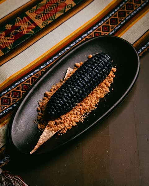 Tortilla de maïs bleue, poulet à la brasa, provolone fondu, salsa verde, ají pollero et ocopa.