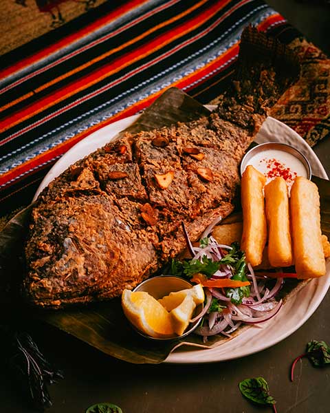Poisson blanc entier frit et croustillant, servi avec des yucas dorées, citron, salsa criolla et sauce acevichada.