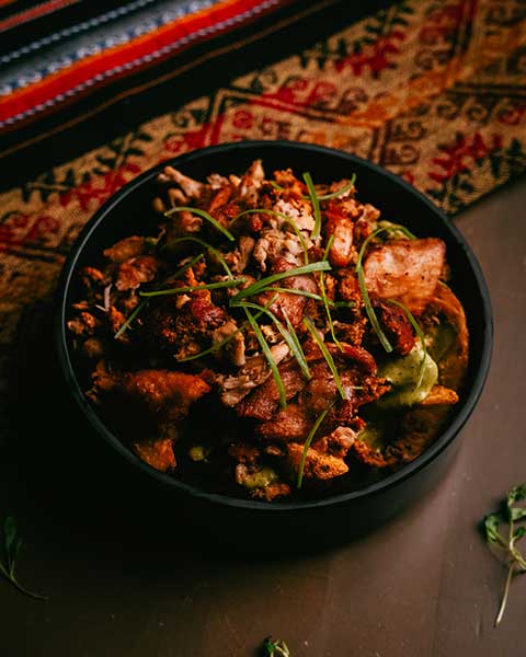 Porc chicharrón croustillant, sauce chi jau kai, wontons frits et notre salsa Pachikay signature.