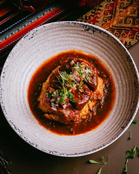 Viande braisée dans une sauce d’ají amarillo, ají panka, et