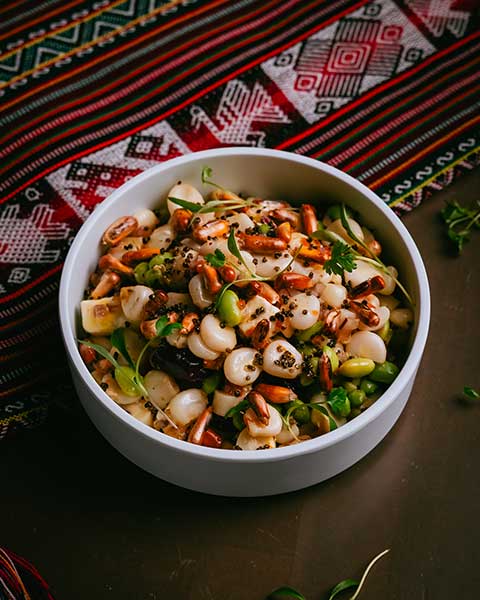 Salade de choclo, queso fresco, edamame, olives Botija et quinoa croquant, vinaigrette à l’ají amarillo.