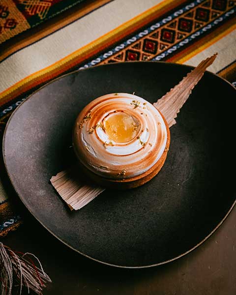 Coque en chocolat mauve, mousse tres leches, chicha morada et crème d’amande à la lime, hommage péruvien à la mazamorra morada et au arroz con leche.